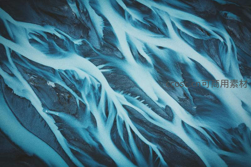 从空中俯瞰冰川融水形成的独特河流网络,如大地的血管般蜿蜒交错,蓝白交织,呈现出令人惊叹的自然抽象艺术。