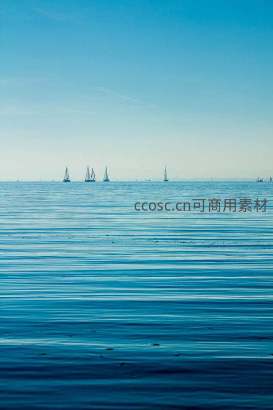 平静如镜的蓝色海面上,几艘白色帆船悠然航行于天际线之下,构成一幅诗意盎然的海上画卷,唤起旅行向往。