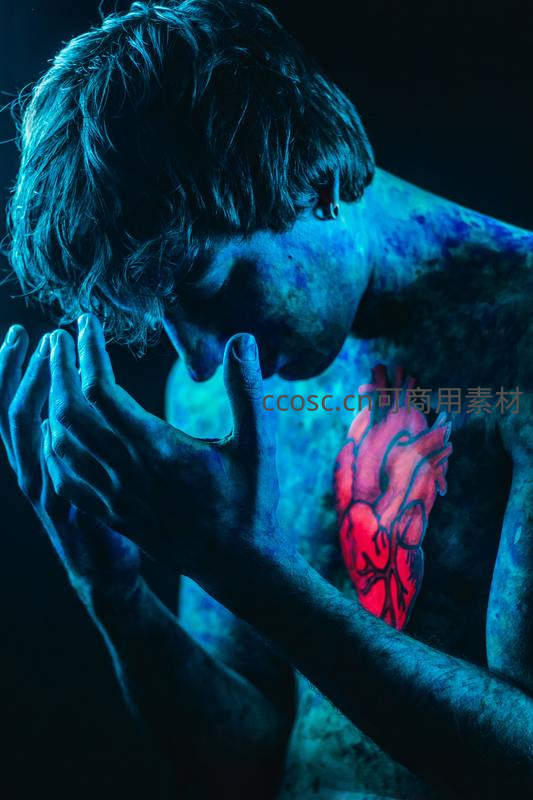 一名男子在冷蓝色灯光下低头沉思,胸前绘制着鲜红发光的心脏图案,强烈的色彩对比与肢体语言共同传达出深刻的情感与艺术表达。