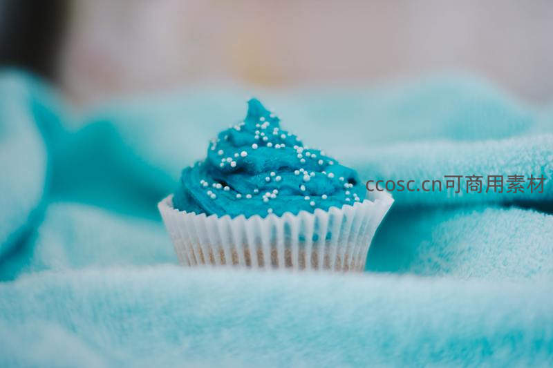 一个点缀着白色糖珠的蓝色奶油纸杯蛋糕,置于柔软的蓝色绒布上,营造出清新甜美的视觉享受。