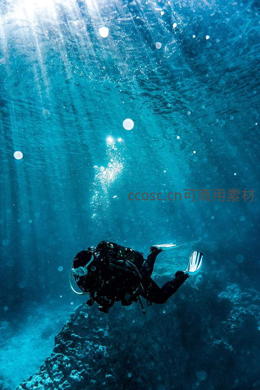 潜水员在蔚蓝海底探索光影