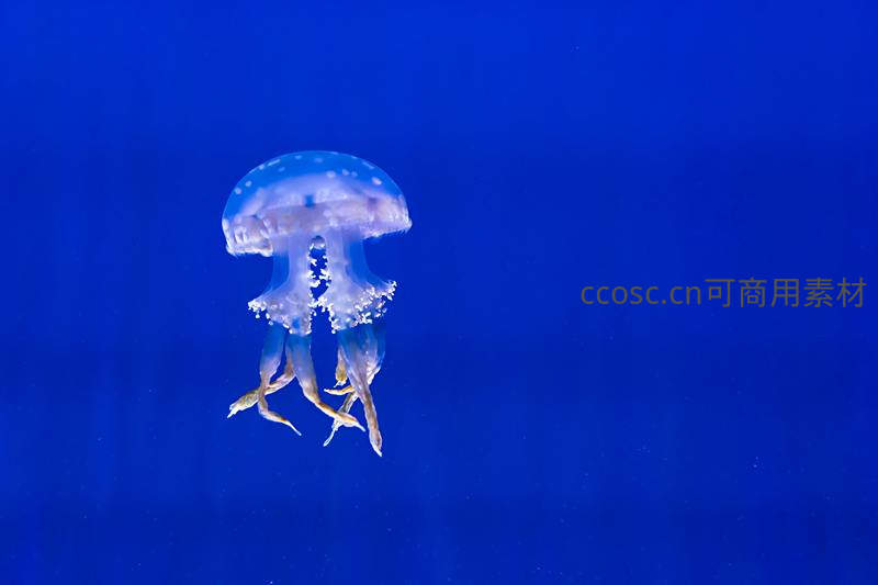 一只半透明的水母在深邃的蓝色海洋中缓缓游动,其伞状身体和细长触须在光线映衬下显得格外梦幻,展现海洋生物的静谧之美。