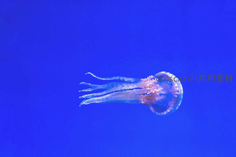 一只粉白相间的水母在纯净的蓝色水域中舒展着细长的触须,姿态柔美而灵动,如同水中舞者,散发着宁静而神秘的魅力。