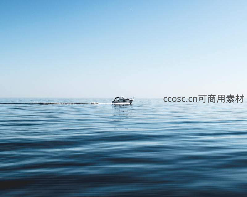一艘小船独自航行在广阔无垠的碧蓝海面上,身后拖曳着细长的白色尾迹,天空澄澈无云,画面充满自由、宁静与探索远方的诗意。