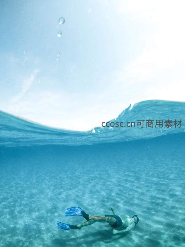 一名浮潜者在清澈见底的碧蓝海水中悠然游弋,视角从水下向上,捕捉到水面波光与上升气泡,尽显夏日海滨度假的惬意与自由。