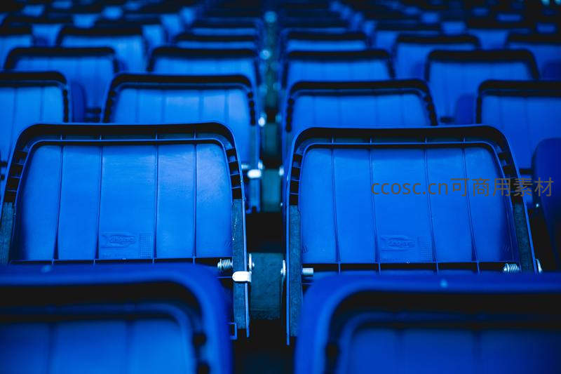 一排排蓝色塑料座椅在灯光下延伸,营造出静谧而有序的空间感,适合大型活动或演出前的宁静时刻。