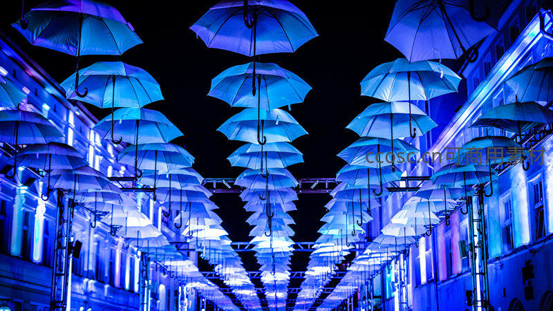 无数蓝色雨伞悬挂在城市街道上空,在霓虹灯光映照下形成一条奇幻的空中走廊,营造浪漫梦幻氛围。