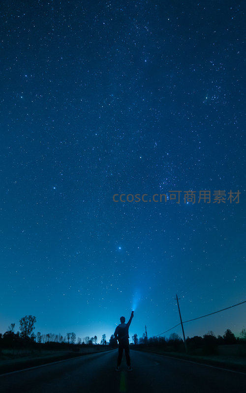 一人独自站在空旷公路上,举着手电筒指向璀璨星河,渺小的身影与浩瀚宇宙形成对比,表达对未知的向往与敬畏。