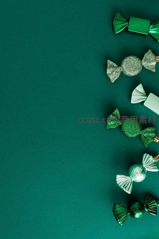 在纯深绿色背景上,几颗包装精美的绿色系糖果错落摆放,营造出简约而富有节日氛围的平面构图。