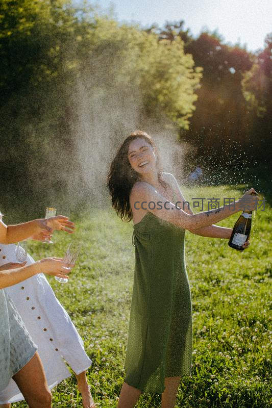 绿裙少女开香槟庆祝,阳光洒满草地