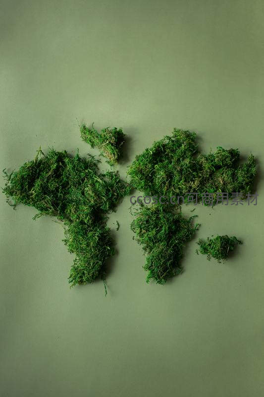 用天然青苔在浅绿色背景上精心拼贴出世界地图轮廓,展现自然与地理的巧妙结合,传递环保与全球互联的艺术理念。