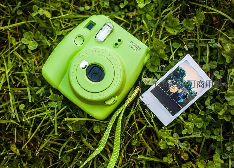 一台青柠绿的拍立得相机静卧在翠绿三叶草间,旁边是刚打印出的温馨合影,定格美好时光。