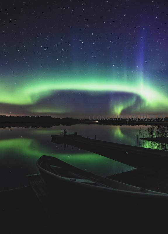 湖面倒影极光璀璨,小舟静泊星夜如梦