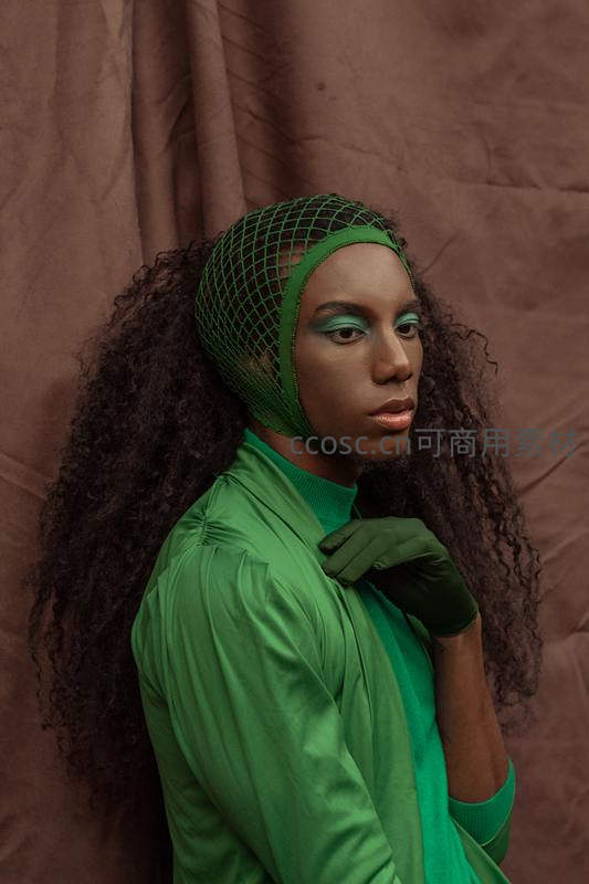 一位身着绿色服饰、佩戴网状头饰的女性,眼神深邃,姿态优雅,背景为暖棕色调,营造出强烈的视觉冲击力。