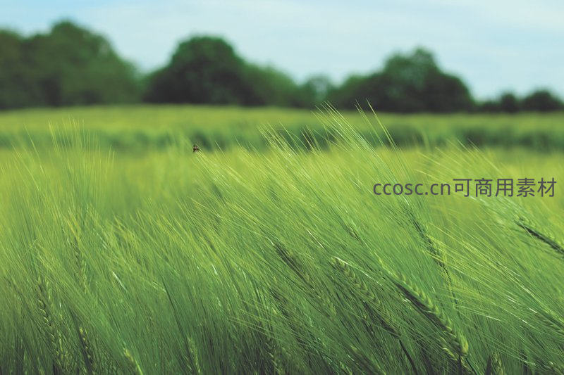 一片生机勃勃的绿色麦田在微风中轻轻摇曳,远处树木模糊成背景,展现出宁静而充满生命力的田园景象。