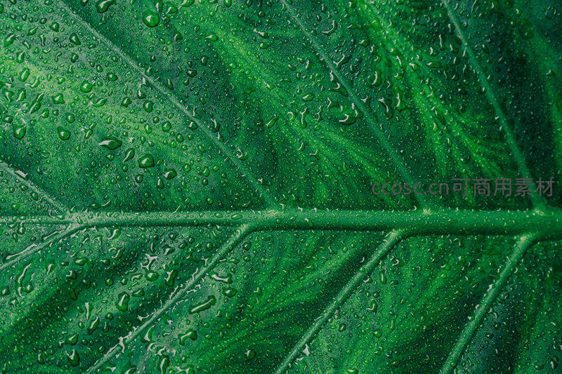 晶莹水珠散落于宽大绿叶之上,叶脉纵横交错,细节清晰,展现雨后植物的鲜活与自然的细腻之美。