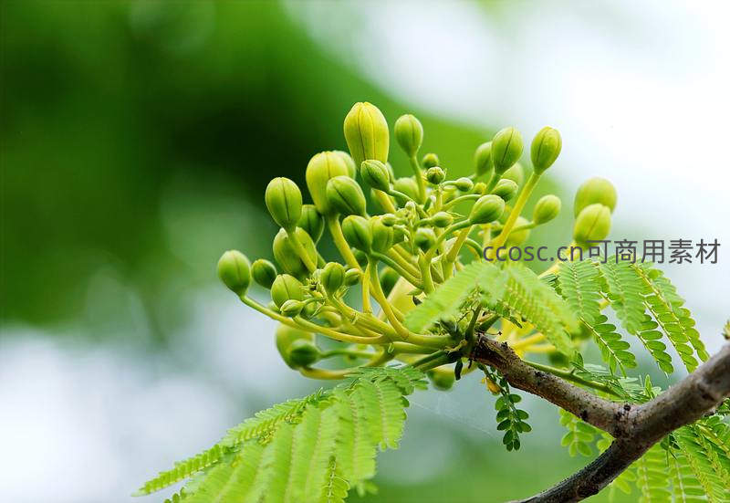 一簇嫩绿的花苞在枝头含苞待放,周围是细密的羽状复叶,在柔和光线下展现出蓬勃的生命力与自然之美。