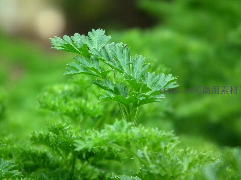 一株鲜嫩翠绿的欧芹在微风中轻轻摇曳,叶片舒展,充满生机,是厨房中不可或缺的调味香草,散发着清新的田园气息。
