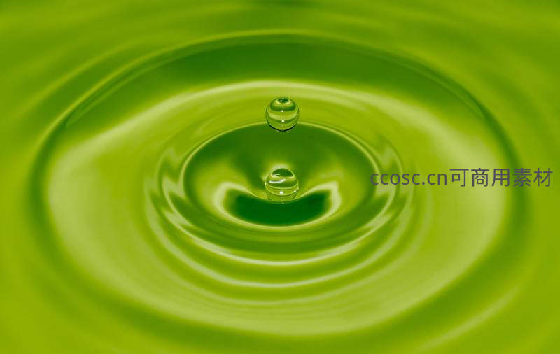 一滴晶莹水珠坠入绿色液体,激起层层同心圆波纹,画面充满动感与艺术美感,展现自然物理现象的精致瞬间。