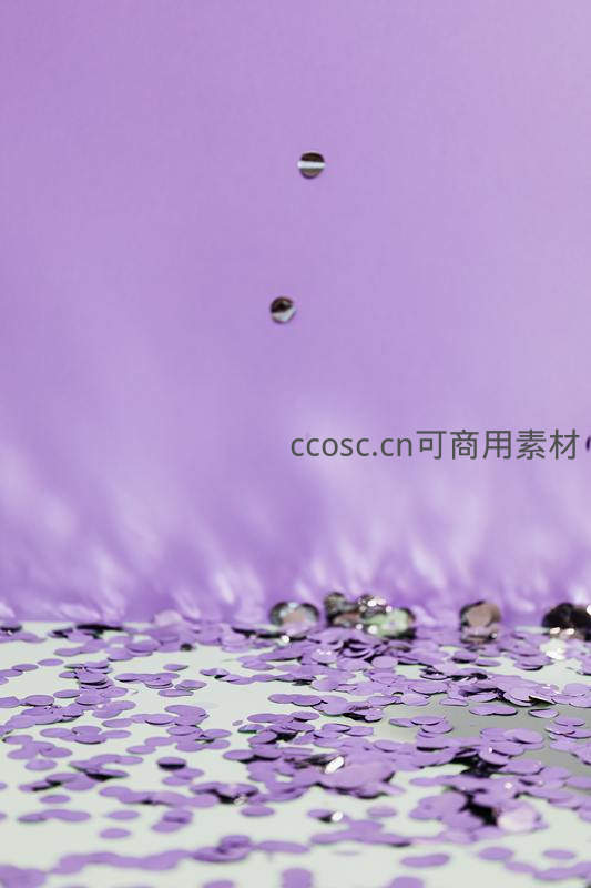 在柔和的紫色背景下,散落着大量紫色与银色的圆形纸屑,几滴晶莹水珠悬浮空中,营造出梦幻而精致的视觉效果。