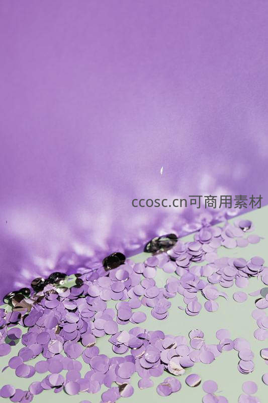 浅绿色平面与紫色背景交界处,大量紫色与银色圆形纸屑自然堆积,光影柔和,营造出静谧浪漫又充满想象力的视觉角落。