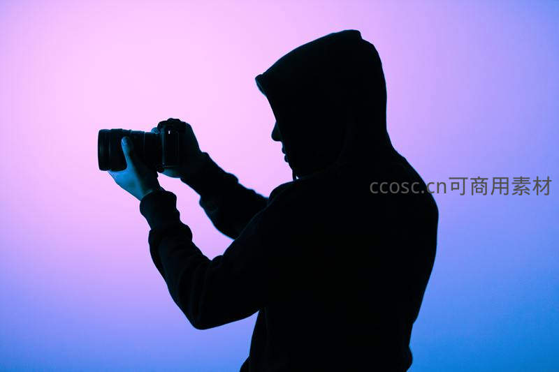 一位身着连帽衫的摄影师在梦幻般的紫蓝渐变光线下专注拍摄,轮廓分明,充满神秘与艺术感。