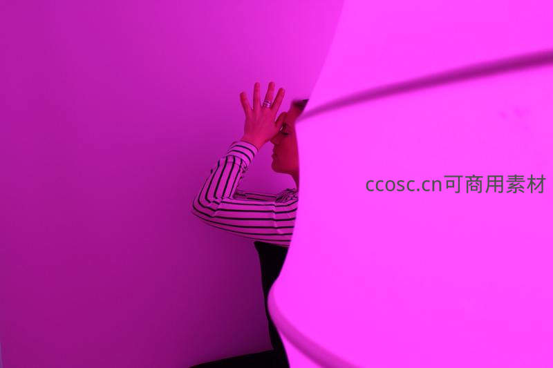 一位身着条纹衬衫的人物在浓郁的粉紫色光线下侧身而立,一手轻抚额头,姿态充满沉思与内省,强烈的色彩与光影塑造了独特的艺术氛围。