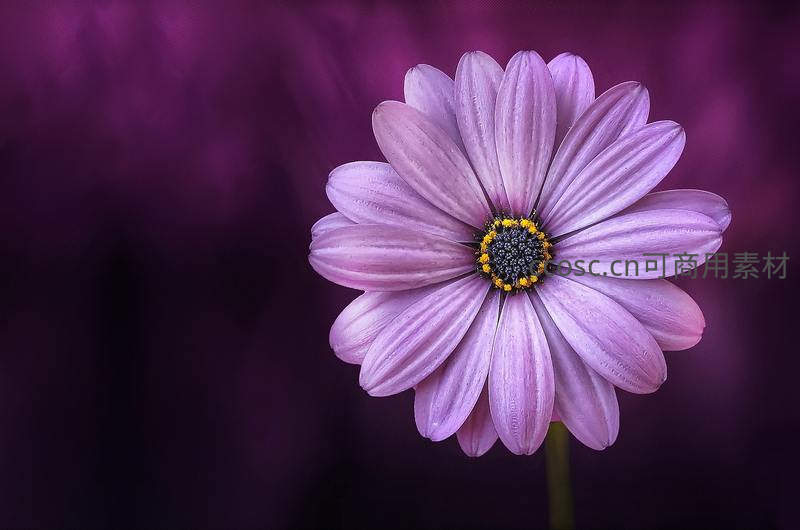 一朵盛开的紫色雏菊在深紫色背景的衬托下格外醒目,细腻的花瓣纹理和金黄的花蕊清晰可见,充满生机。