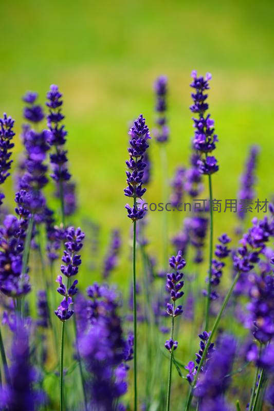 在明媚阳光下,成片的薰衣草绽放出浓郁的紫色,细长花穗随风轻摇,背景绿意朦胧,营造出宁静浪漫的田园氛围。