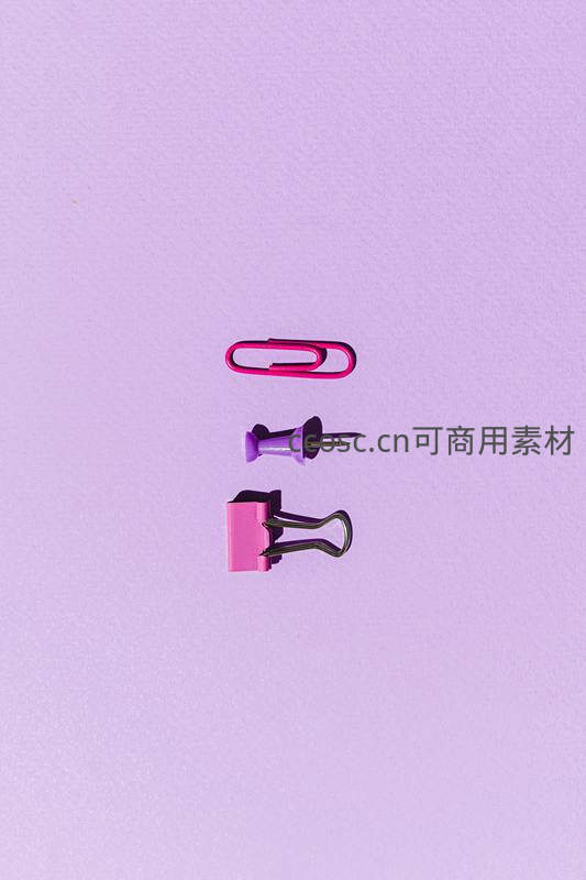 三件紫色系办公文具在淡紫色背景上垂直排列,包括回形针、图钉和长尾夹,构图简洁,色彩统一,适合用作设计素材或办公主题配图。