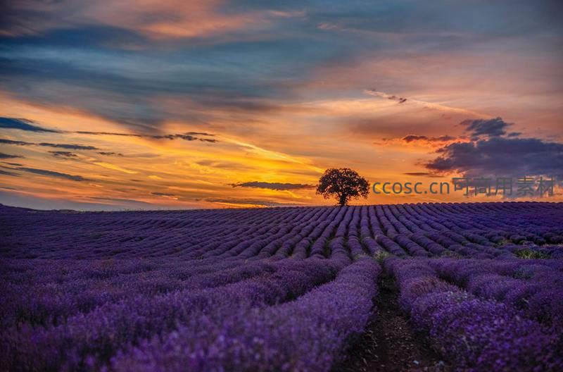 广阔的薰衣草田在绚丽的夕阳下泛着紫色波浪,一棵孤树矗立其间,构成一幅宁静而浪漫的田园诗画。