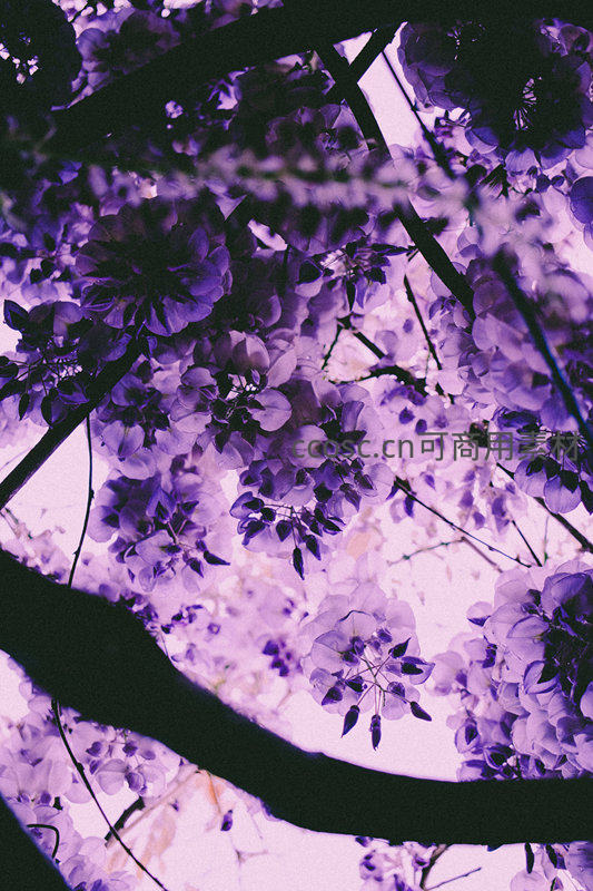 从树下仰望盛开的紫藤花,紫色花瓣在柔和光线下层层叠叠,枝干剪影勾勒出梦幻般的自然画卷,充满春日浪漫气息。
