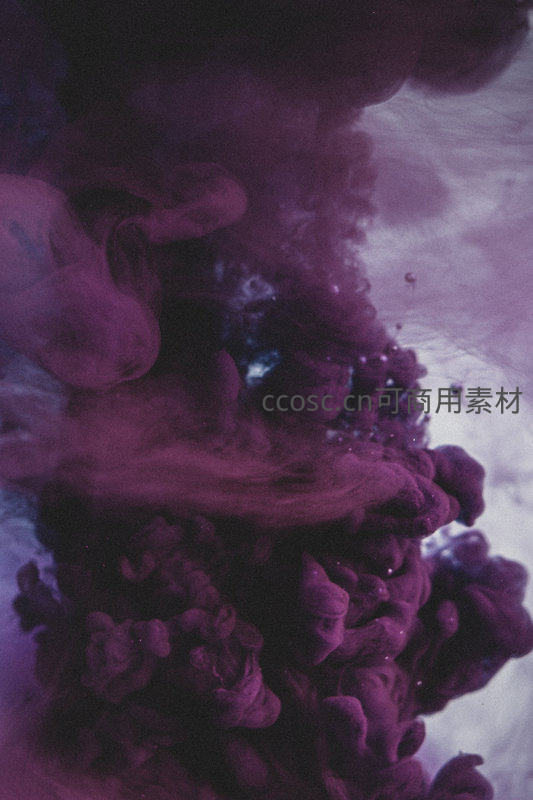 深紫色颜料在清澈液体中缓缓扩散、交融,形成如云似雾的抽象图案,充满神秘感和流动的艺术美感。