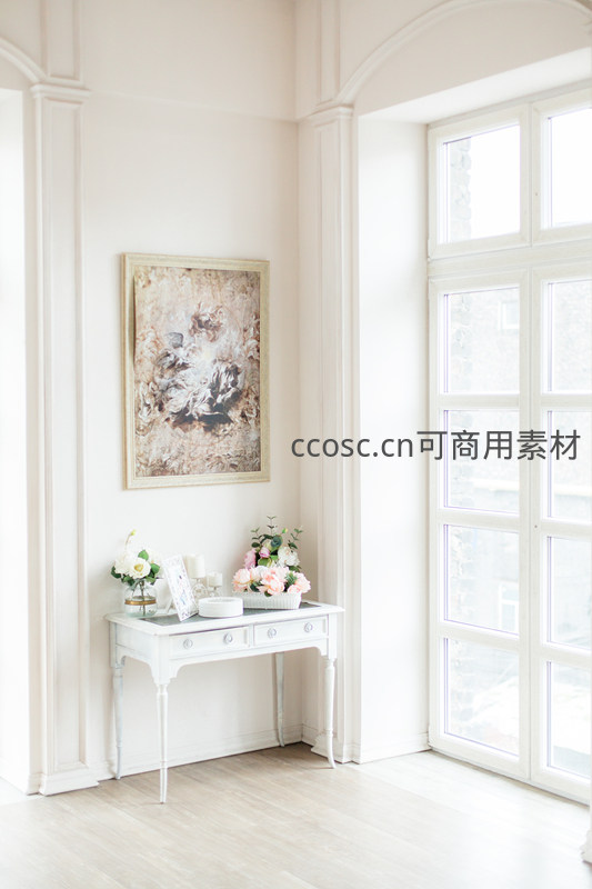 明亮的法式窗户旁,一张白色小桌摆着鲜花与画作,阳光倾泻而入,营造出宁静优雅、充满生活气息的家居角落。