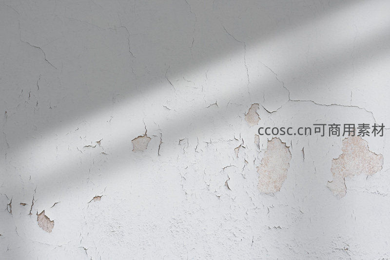 一面布满细密裂纹和剥落痕迹的白色旧墙,被一道斜射进来的阳光照亮,光影交错,营造出静谧而富有质感的艺术氛围。