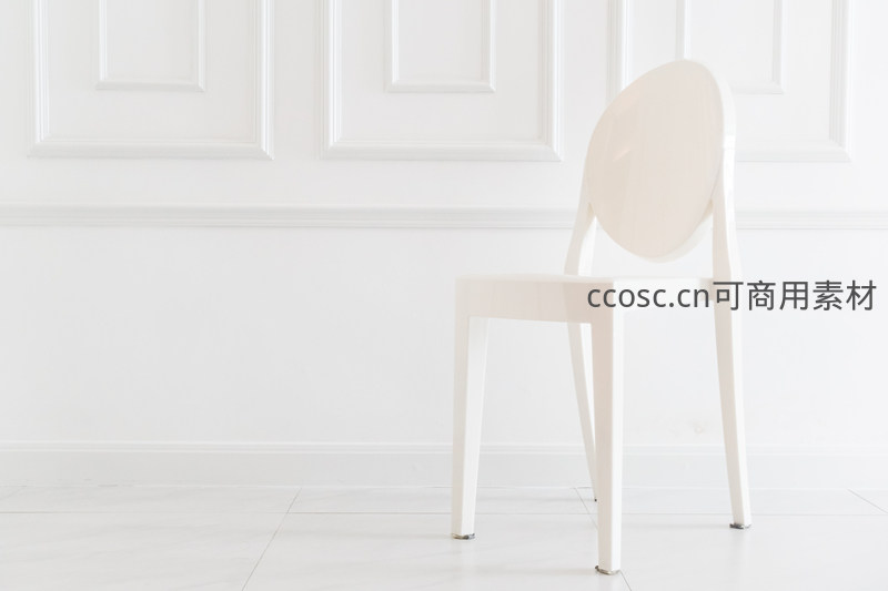 一把造型流畅的白色半透明塑料椅,置于纯白线条装饰的墙面前,整体空间干净明亮,展现了现代极简主义的设计美学与宁静感。