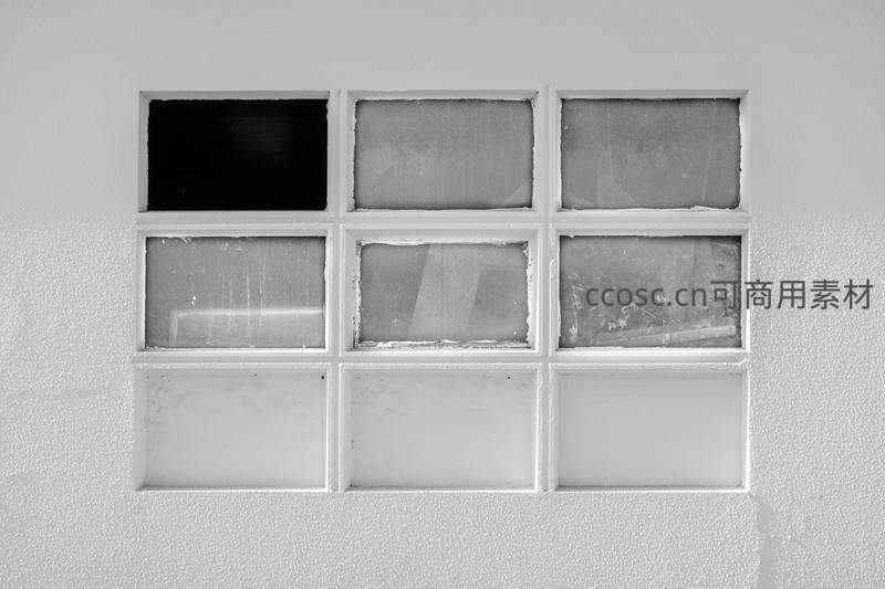 一扇由九块玻璃组成的窗户,部分玻璃模糊或破损,在白色墙壁上投下斑驳的光影,呈现出极简主义的视觉美感。