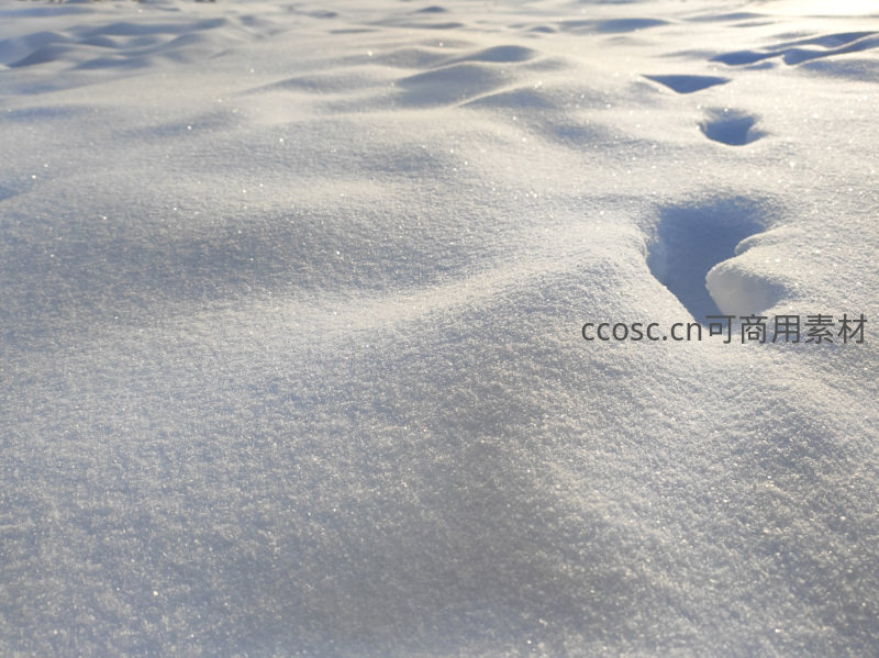 细腻的白雪在阳光照射下闪闪发光,几处清晰的脚印打破了雪面的宁静,展现了冬日里人与自然互动的温柔瞬间。