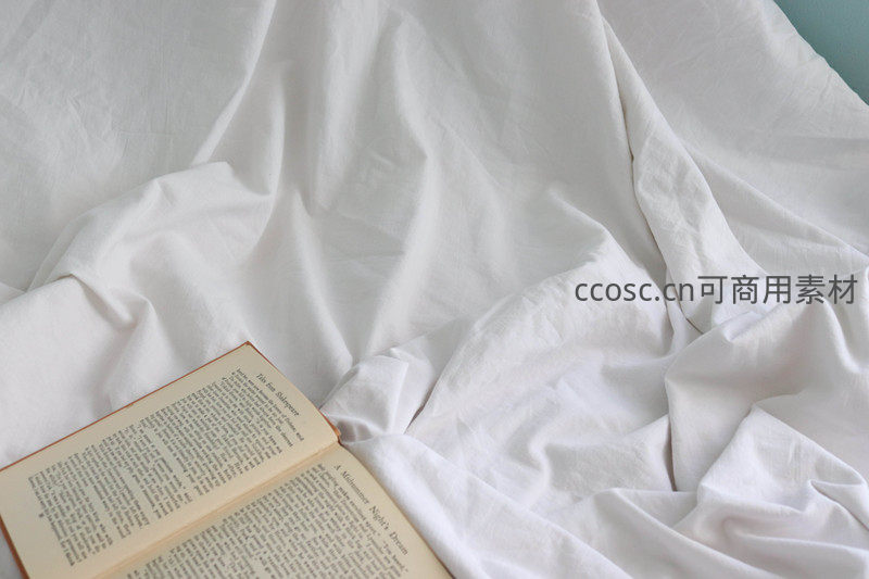 一本打开的复古书籍安静地躺在洁白柔软的床单上,褶皱自然,光线柔和,营造出宁静舒适的阅读氛围,体现慢生活的文艺格调与居家美学。