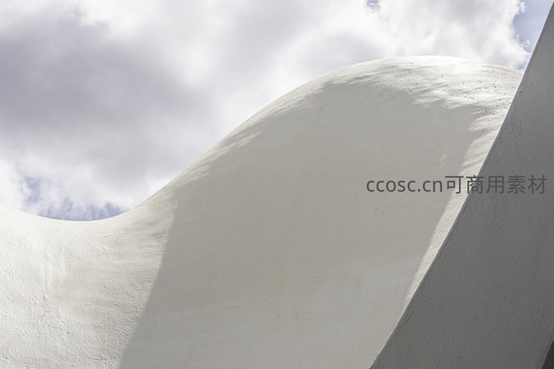 流畅的白色曲面建筑在蓝天白云下展现优雅线条,光影交错间凸显现代建筑设计的美学与空间感。