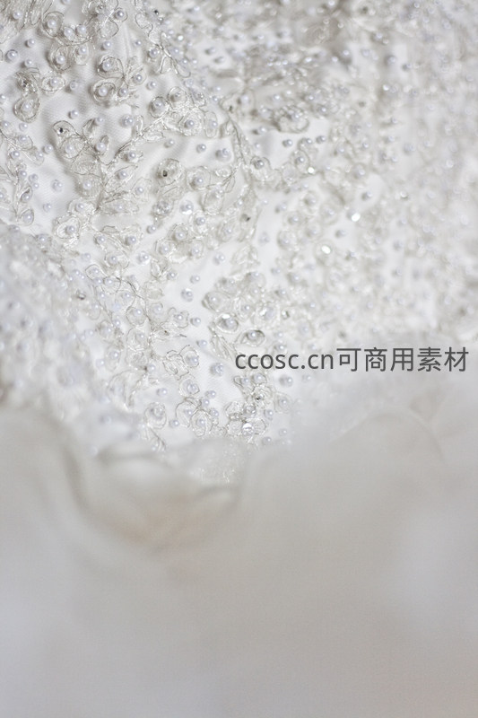 婚纱上精美的珠饰与蕾丝刺绣特写,每一颗珍珠和亮片都闪耀着柔和光泽,细腻的纹理与轻盈的薄纱共同营造出梦幻浪漫的婚礼氛围。