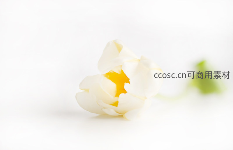 一朵洁白的郁金香在纯白背景下静静绽放,花瓣层层叠叠,中心透出温暖的黄色,营造出宁静而高雅的视觉氛围。