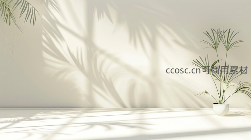 一盆小型绿植置于素净墙面旁,阳光穿过叶片在墙上投下斑驳剪影,为空间增添自然气息与宁静舒适的居家氛围。