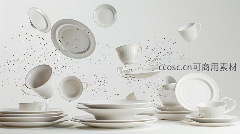 悬浮的白色餐具与飞溅水珠的静谧瞬间