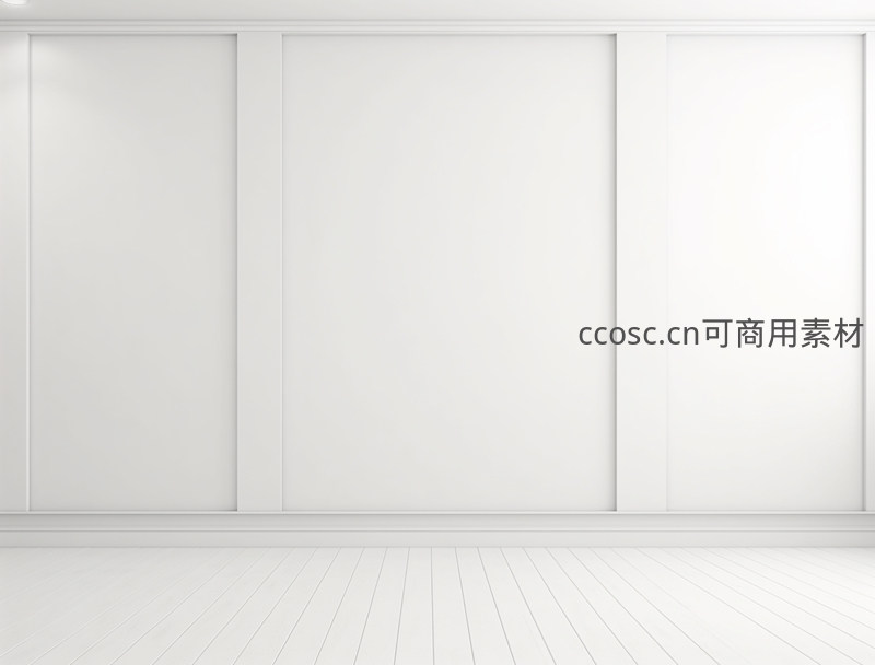 一个极简风格的室内空间,纯白色墙面搭配浅色木质地板,线条干净利落,营造出宁静、明亮且宽敞的视觉感受。