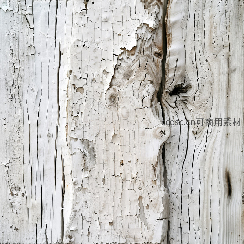 一块饱经风霜的木板,白色油漆剥落,露出深浅不一的木质纹理和节疤,记录着时光流逝的沧桑与质感。