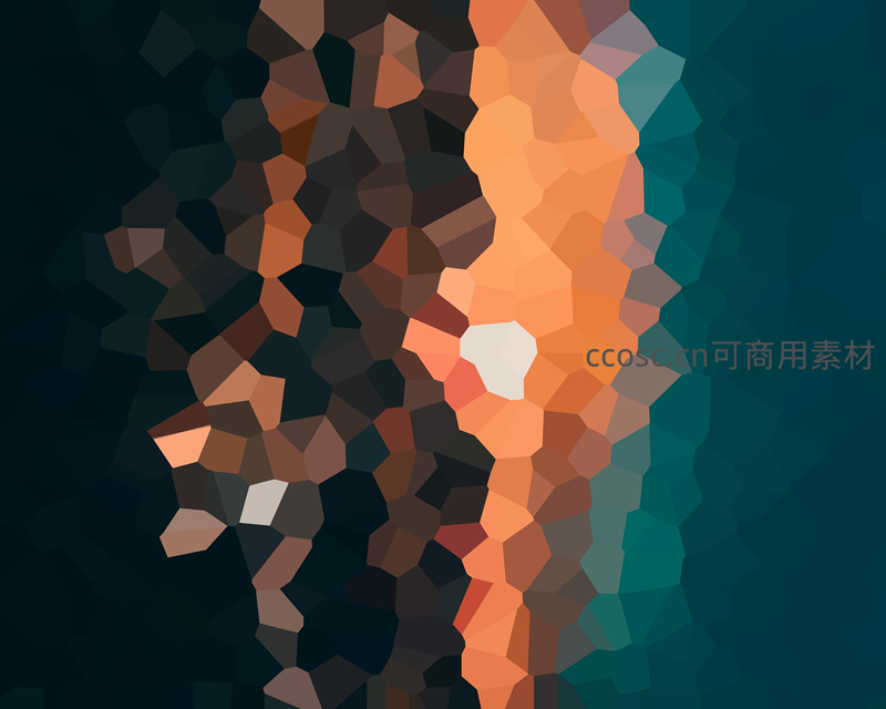 橙棕与青绿色块在深色底上碰撞融合,多边形结构赋予画面动态节奏感,呈现出自然与科技交融的抽象美感。