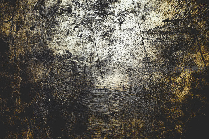 强烈的光影对比突显金属表面的刮痕与裂纹,黑白与金色交织,营造出硬朗、粗犷的工业风格,适用于科技、机械类主题视觉设计。