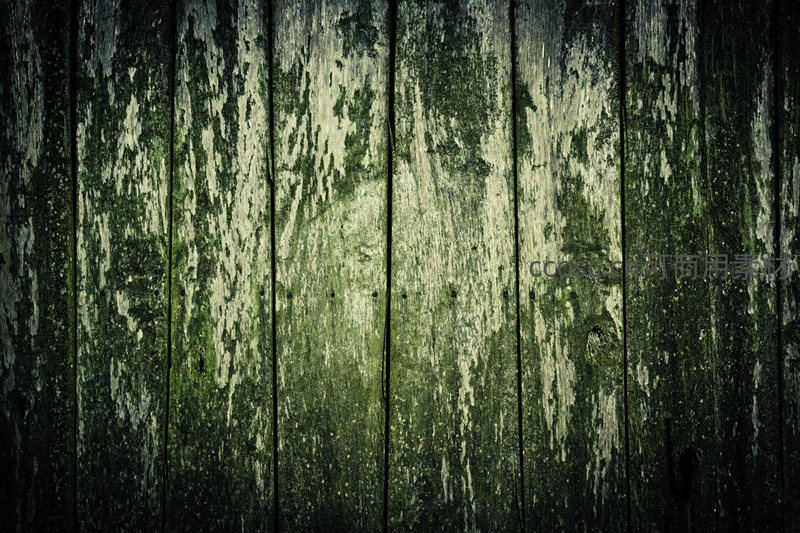 深绿色的苔藓在陈旧木板上蔓延生长,与褪色的木纹形成强烈对比,整体色调偏暗,充满潮湿森林或废弃小屋的神秘气息。