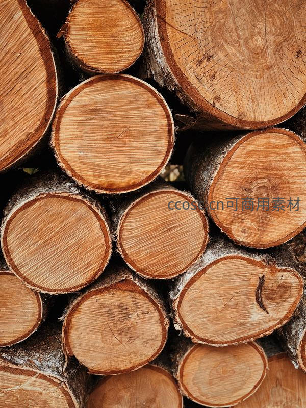 一堆刚砍伐的原木紧密堆叠,截面清晰展示着树木的年轮和天然纹理,散发着原始、质朴的自然气息。